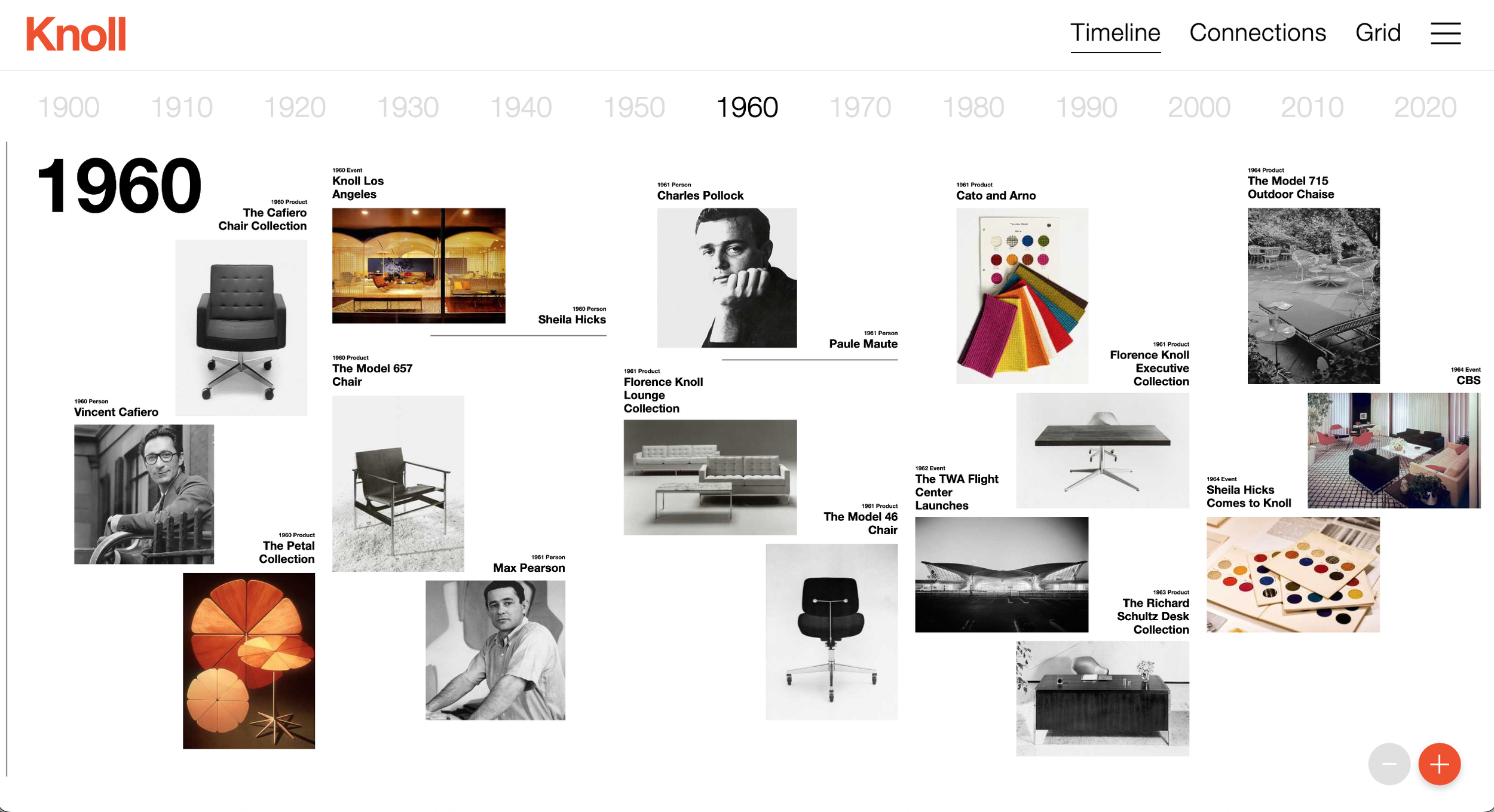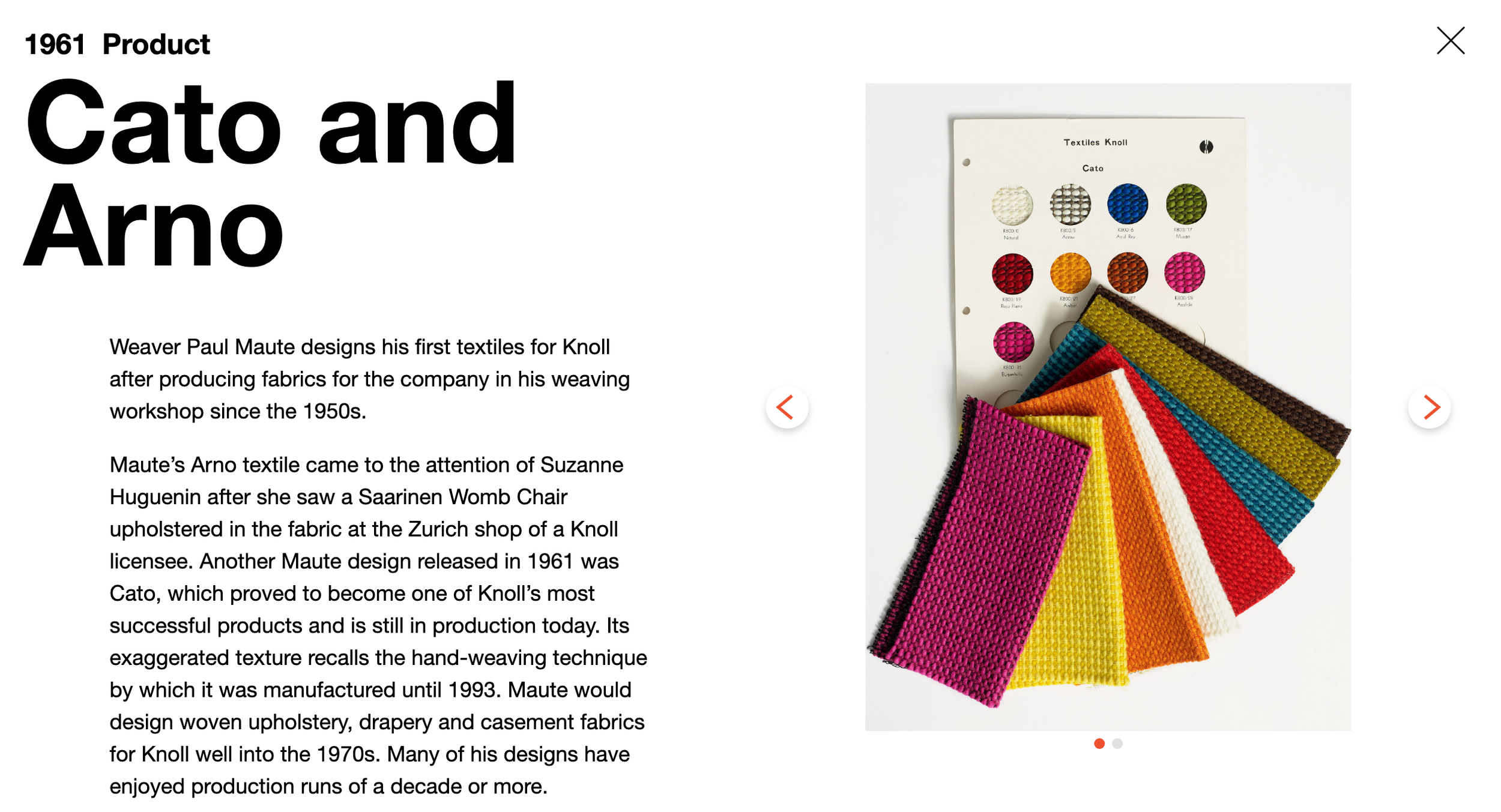 I partnered with Knoll to develop The Archive, an interactive timeline of the company’s history. I curated, researched, and wrote new timeline entries spanning over 100 years of design, and uncovered the many personal and professional connections linking the design luminaries and institutions that shaped Knoll's legacy. The new Archive also incorporates the history of KnollTextiles, and spotlights the many contributions of women designers.